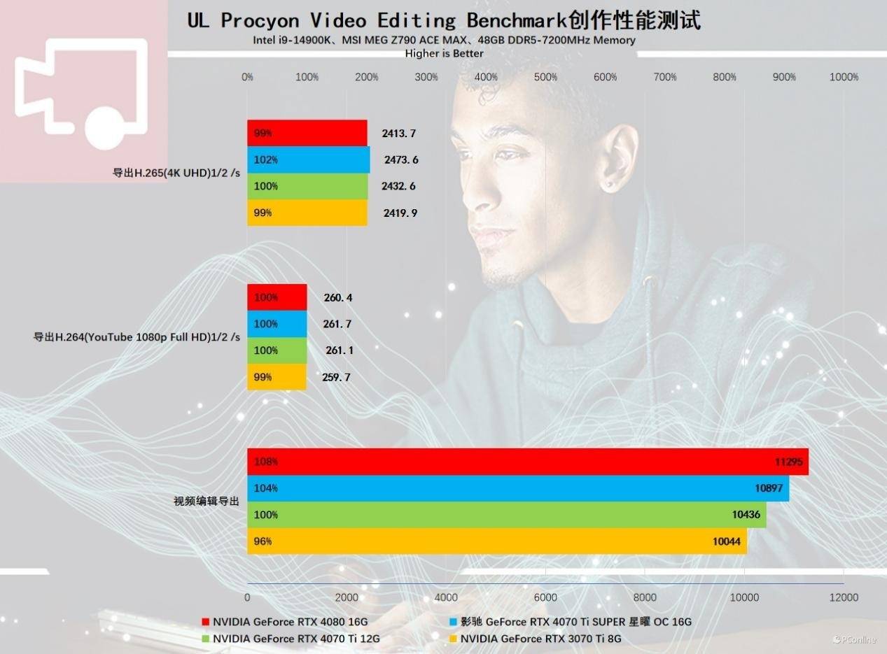 在UL Procyon的图像和视频编辑基准测试中,影驰RTX 4070 Ti SUPER星曜OC整体相比RTX 4070 Ti有着小幅的提升。并且由于采用新的NVENC编码器,整体的编解码效率要比上一代RTX 3070 Ti领先不少。