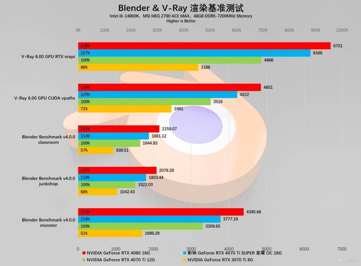 在Blender和V-Ray渲染软件中,影驰RTX 4070 Ti SUPER星曜OC对比RTX 4070 Ti平均提升来到了18%,表现相当亮眼。