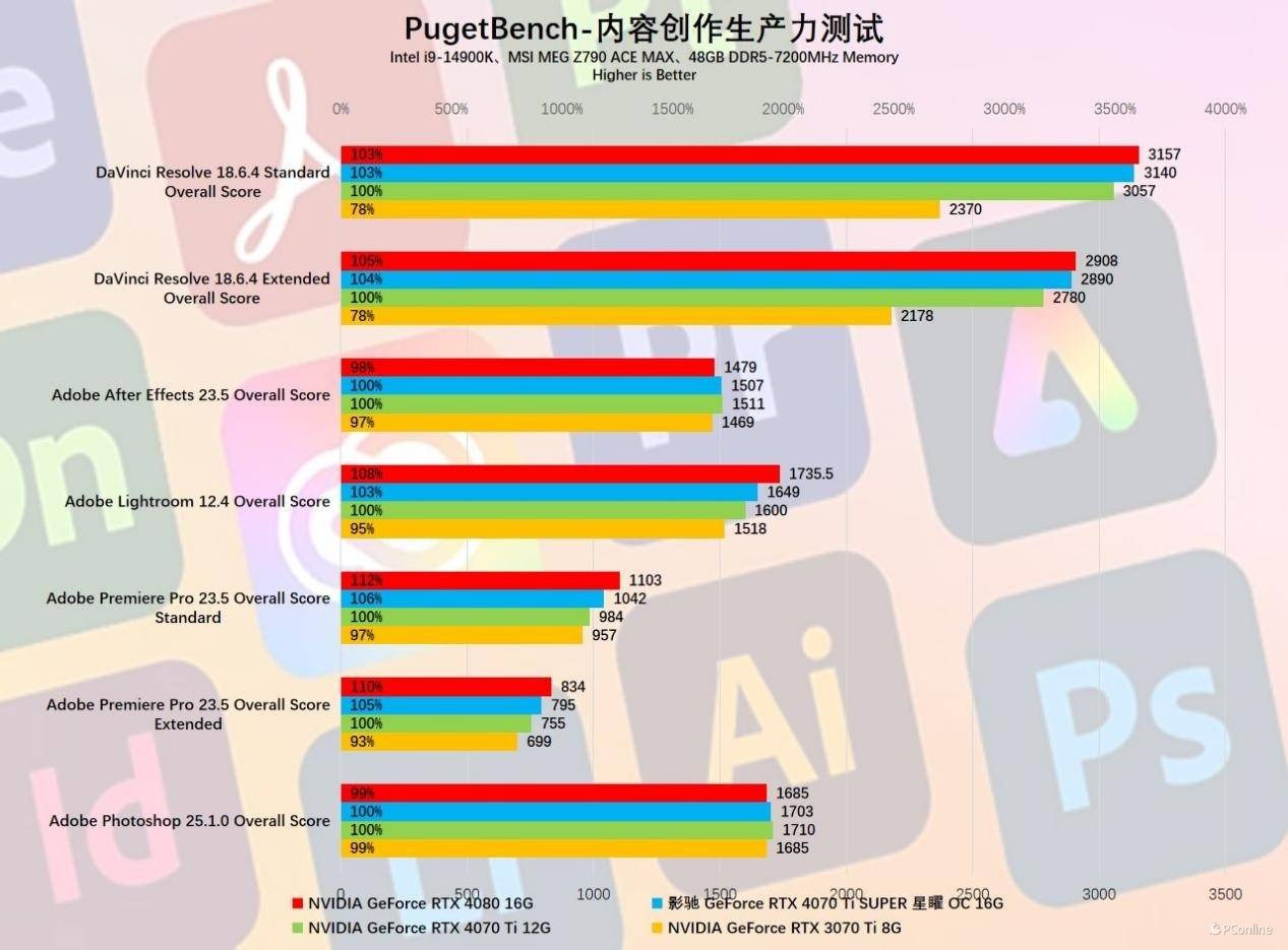 在Adobe或达芬奇等软件的Benchmark中,影驰RTX 4070 Ti SUPER星曜OC也和前面测试类似,整体强于RTX 4070 Ti,略微落后RTX 4080。
