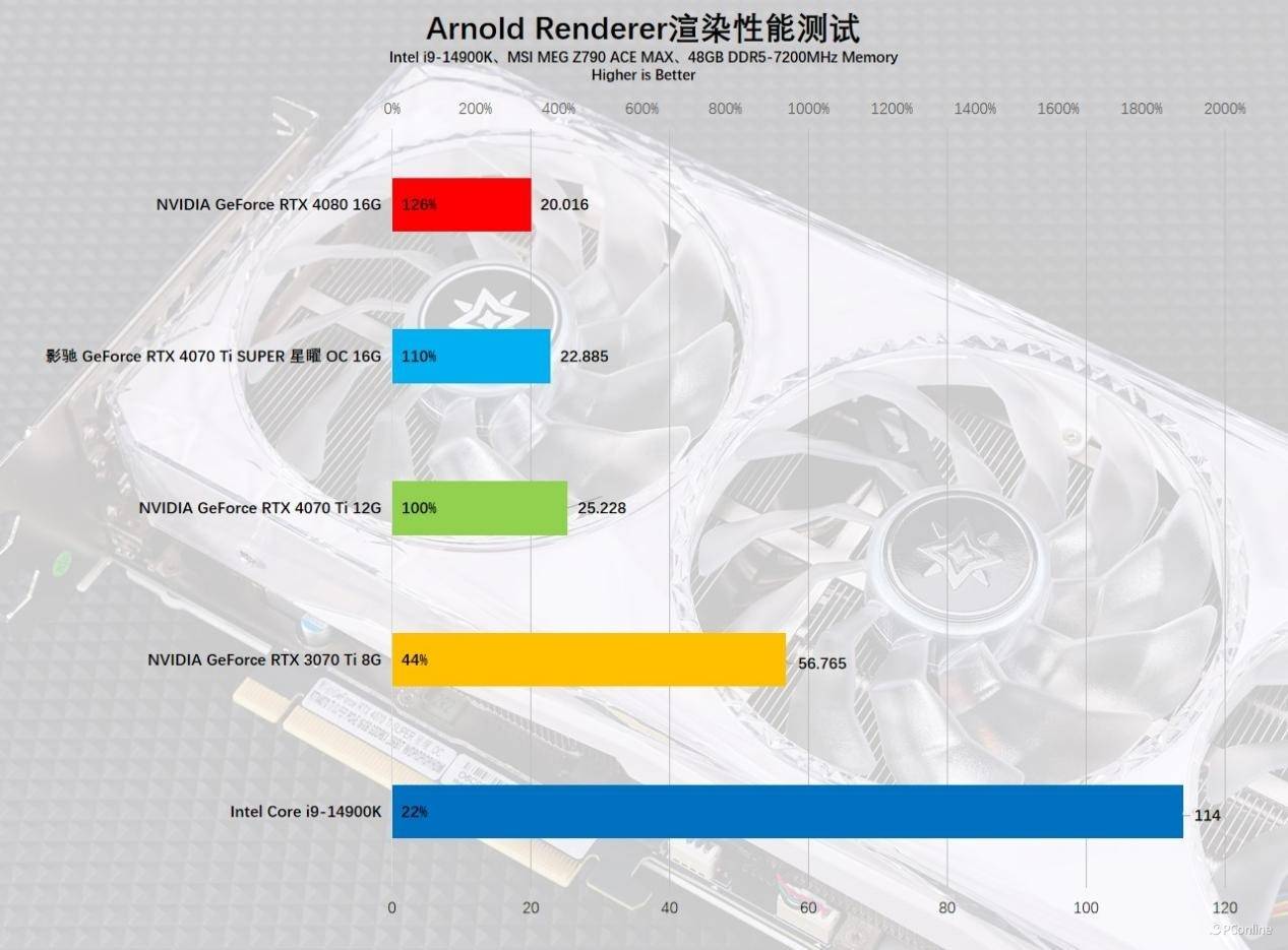 在Arnold渲染器上,影驰RTX 4070 Ti SUPER星曜OC的性能表现也是如此,领先RTX 4070 Ti 10%。