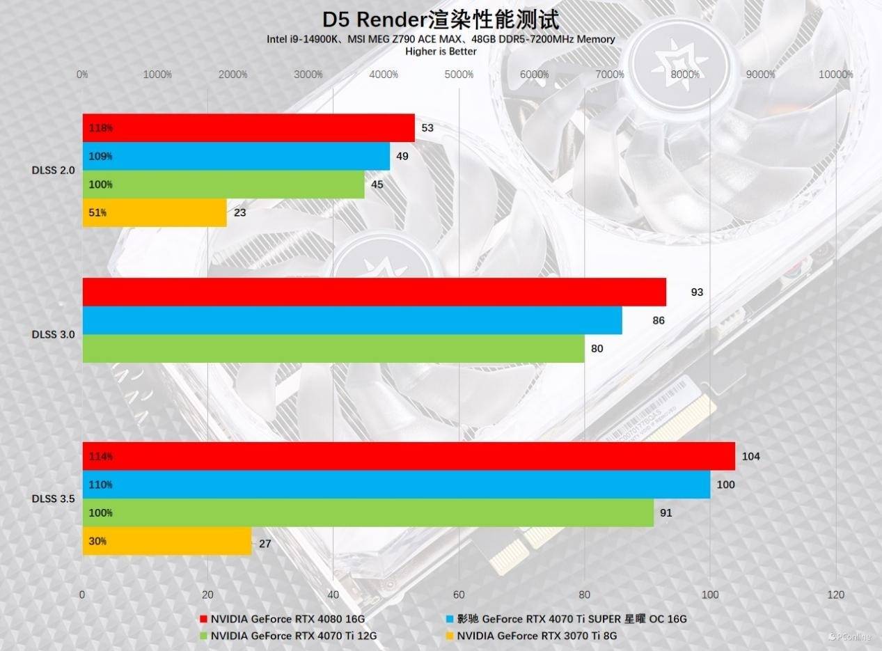 在基于DXR和光线追踪技术构建的GPU渲染器D5 Render上,支持最新DLSS 3和DLSS 3.5的影驰RTX 4070 Ti SUPER星曜OC,在启用 DLSS 帧生成和光线重建后,视窗中的帧率相比之前开启DLSS 2提升几乎两倍,整体的性能表现依旧是强于RTX 4070 Ti。
