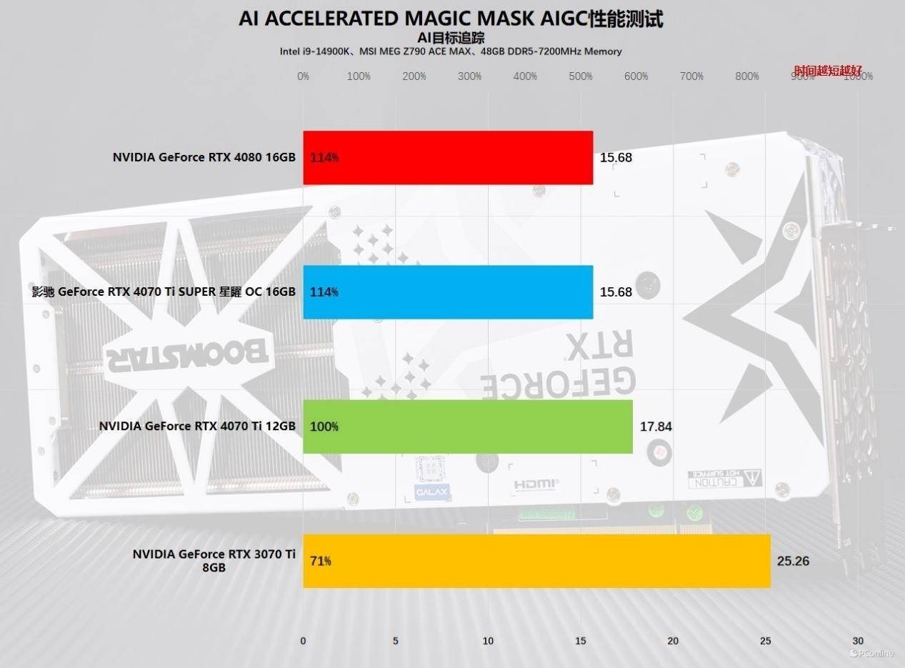 在实际的AI测试场景中,影驰RTX 4070 Ti SUPER星曜OC在达芬奇AI ACCELERATED MAGIC MASK测试,跑出了15.68秒的成绩,表现和同为16GB显存的RTX 4080一致,大幅领先RTX 4070 Ti。