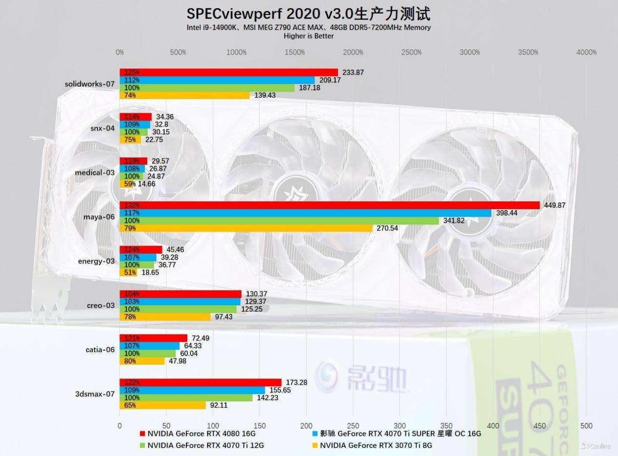 而在专业软件合集SPEC 2020中,影驰RTX 4070 Ti SUPER星曜OC对比RTX 4070 Ti平均也有10%的提升。
