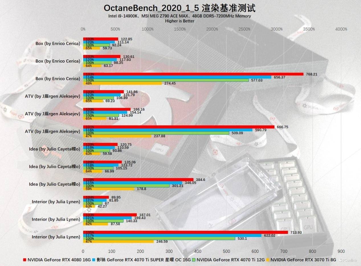 在OC渲染器中,情况依旧类似,影驰RTX 4070 Ti SUPER星曜OC对比RTX 4070 Ti有着接近20%的提升。