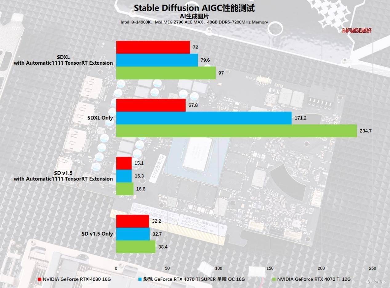 AI性能的提升也是这次影驰RTX 4070 Ti SUPER星曜OC的一大重头戏,相比RTX 4070 Ti,16G大显存容量不仅意味着影驰RTX 4070 Ti SUPER星曜OC在高分辨率游戏有更好的性能,在AI用途,特别是AI绘图方面也有更卓越的性能表现。