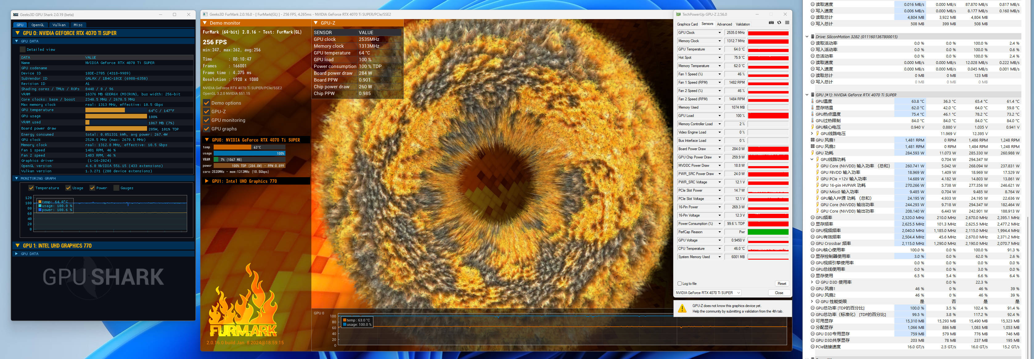 实测Furmark烤机20分钟后,影驰RTX 4070 Ti SUPER星曜OC的核心最终温度稳定在64度,热点温度75.9度,显存62度,此时显卡最大功率为284W。这样的温度控制,再一次证明了星曜系列上的这个星卓III散热系统的强劲解热能力。也看得出这次的影驰RTX 4070 Ti SUPER星曜OC相比RTX 3070 Ti,能效比要好太多了。