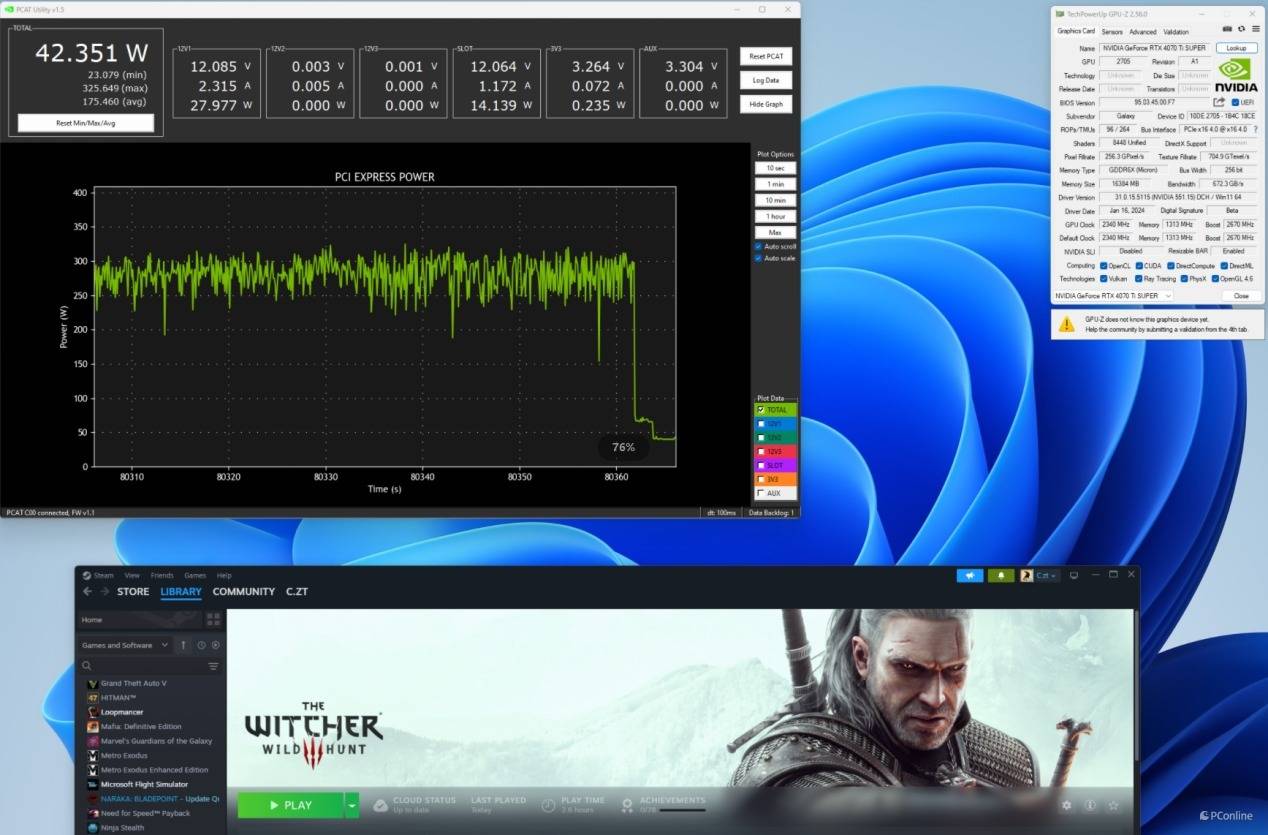 此外我们也用HWINFO与PCAT工具对影驰RTX 4070 Ti SUPER星曜OC不同使用场景的功耗进行监控,可以看到在游戏场景,影驰RTX 4070 Ti SUPER星曜OC的功耗释放可以达到300W以上,在游戏场景功耗释放甚至可以达到325W。而相比公版FE更激进的功耗释放,也是这张影驰RTX 4070 Ti SUPER星曜OC拥有更加出色性能的保障。