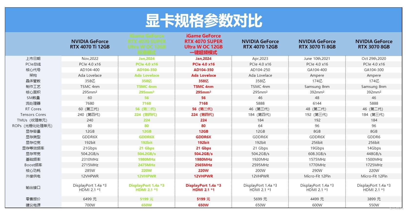 同时GeForce RTX 4070 SUPER 12GB基础频率也从之前的 GeForce RTX 4070显卡提高了60MHz达到了1980MHz,Boost加速频率则是同为2475MHz。当然对于iGame GeForce RTX 4070 SUPER Ultra W OC 12GB这类AIC厂商推的非公版来说,一键超频模式下Boost频率达到2565MHz,而且根据散热和电压等限制阈值的提升,实际运行频率可以达到更高水平。