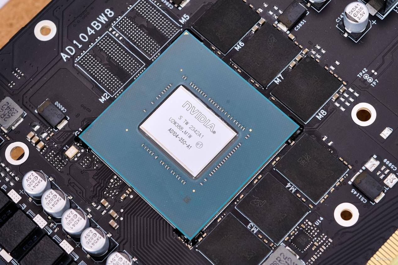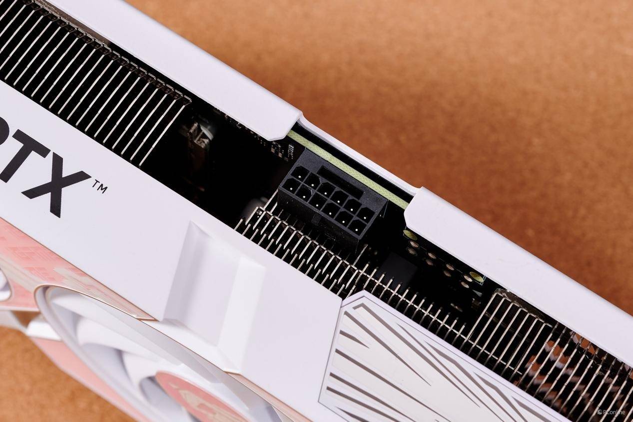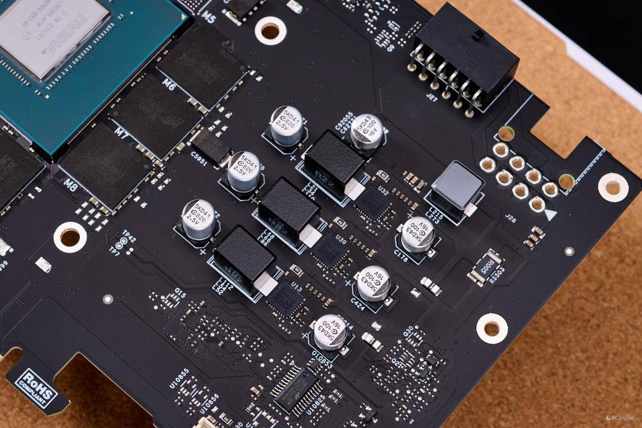 iGame自家的AD104核心方案PCB,供电分列PCB左右两侧,中间是GPU与6颗显存,PCB右上则是12VHPWR接口,以及后备的8Pin辅助供电接口。