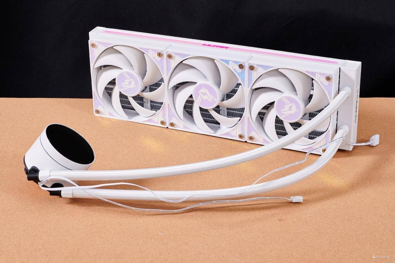 iGame LQ360 Ultra W 360一体式处理器水冷散热器,冷头“深渊镜”ARGB灯效,侧边带上同步灯效圈设计,配上三把iGame F12025 Ultra W 12cm风扇。