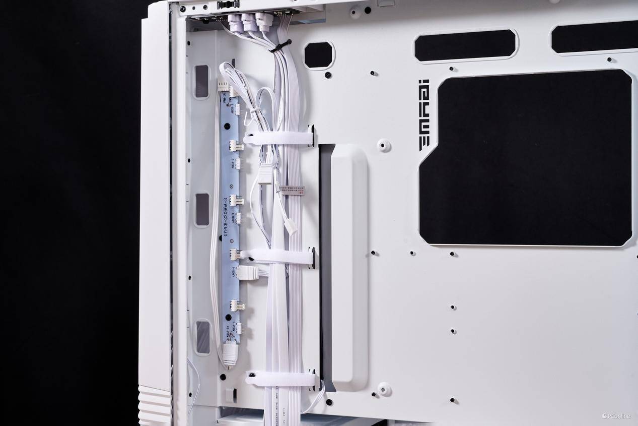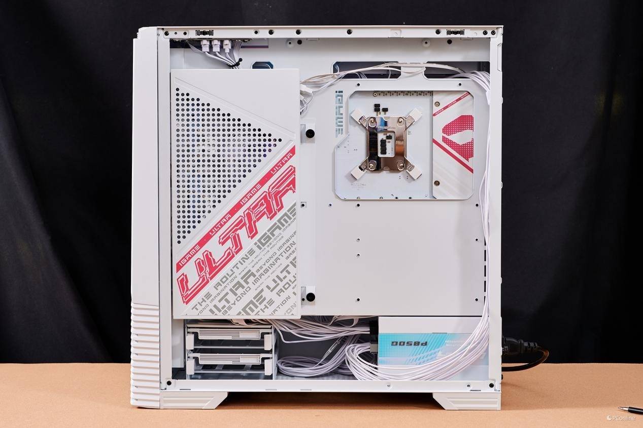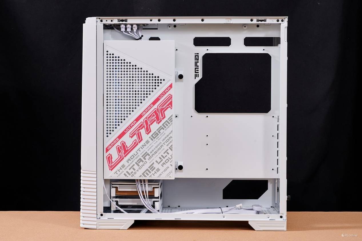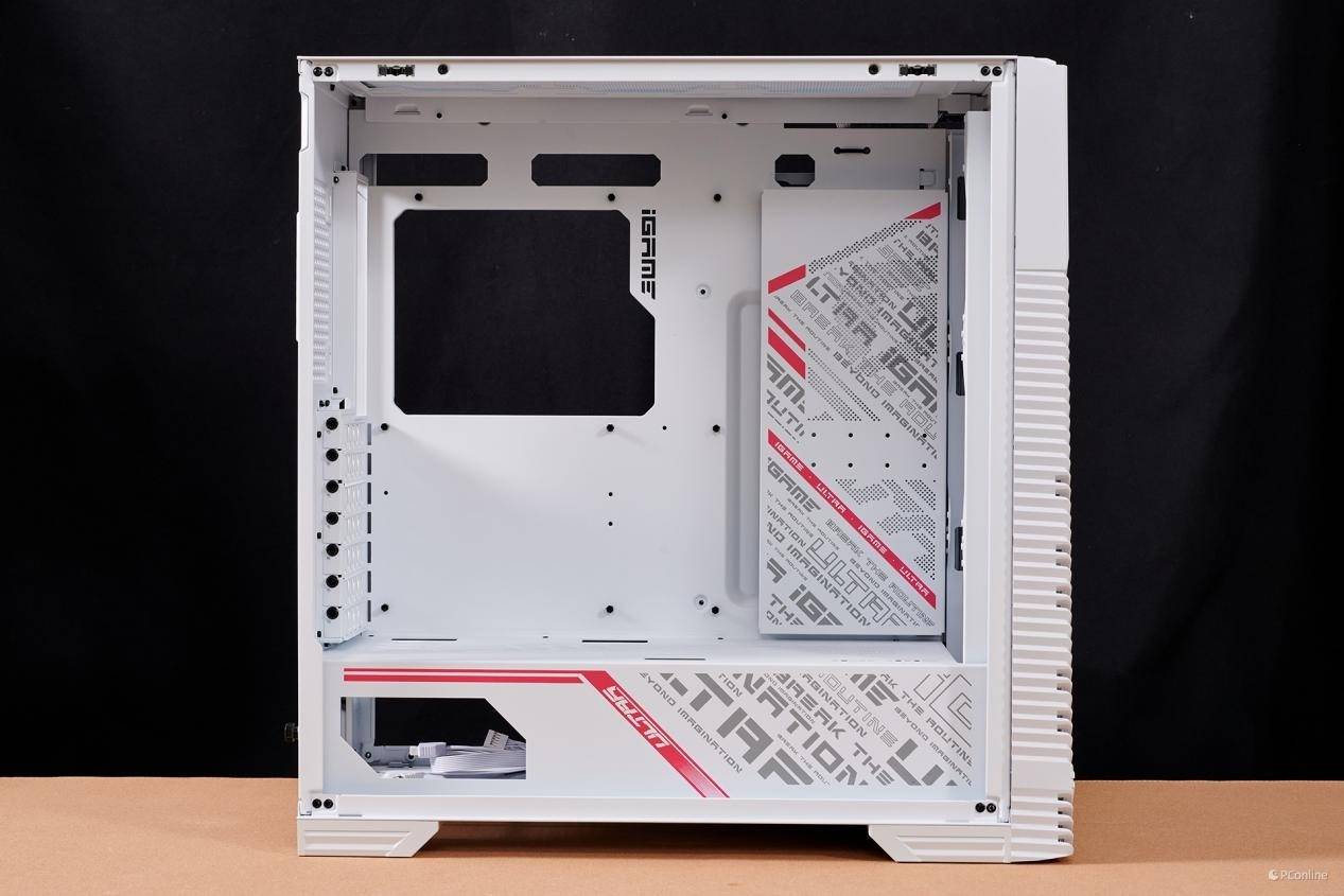 内部设计相当敞亮,最大支持ATX主板,右侧是iGame主题的“点阵式”特效灯板,同时此金属板上带有显卡支撑功能。