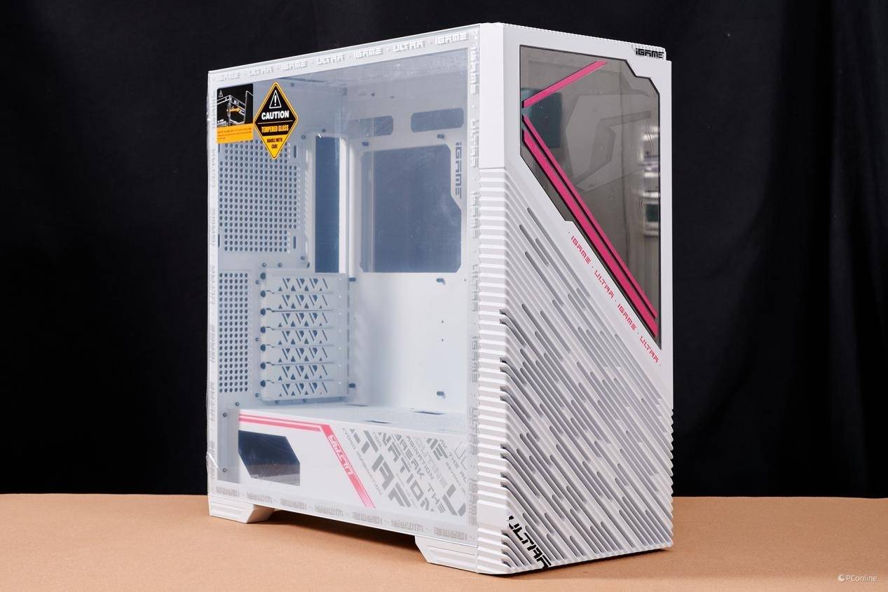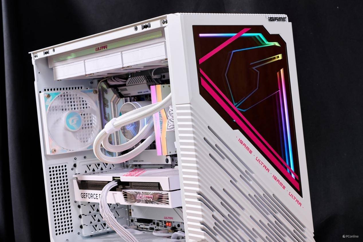 iGame C23A Ultra W机箱,两侧均为钢化玻璃侧板,前面是iGame主题的“深渊镜”特效灯板。
