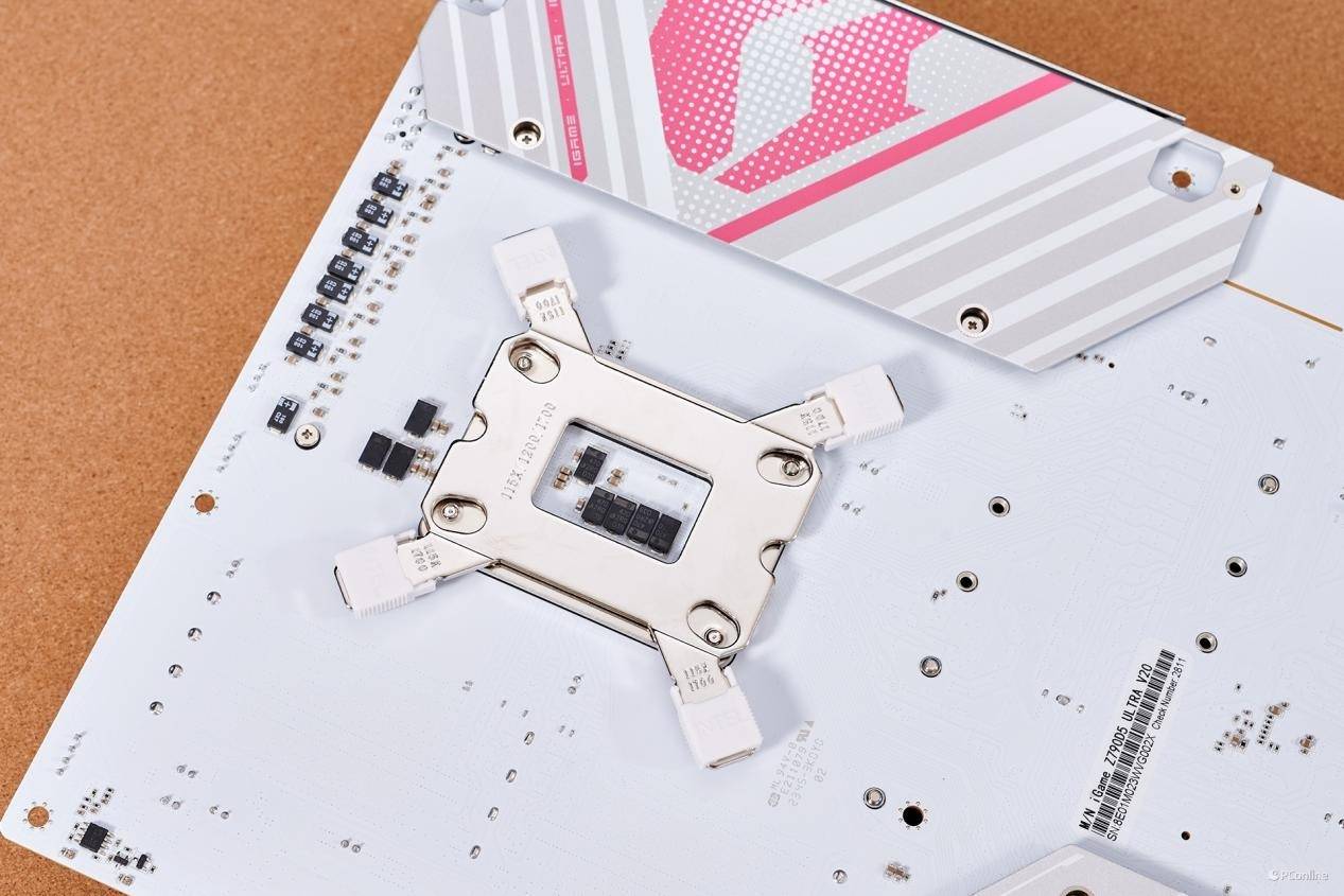 PCB左侧的8相核心供电,每相供电均由固态电容+全封装电感+DrMos MOSFET组合而成,主控是背部的UPI uP9512R PWM芯片。