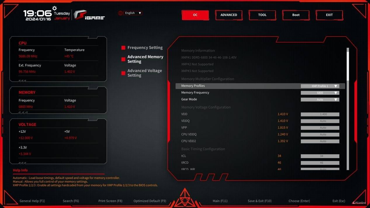内存则是直接读取XMP,这样内存就运行在Gear2模式下DDR5-6800 C34