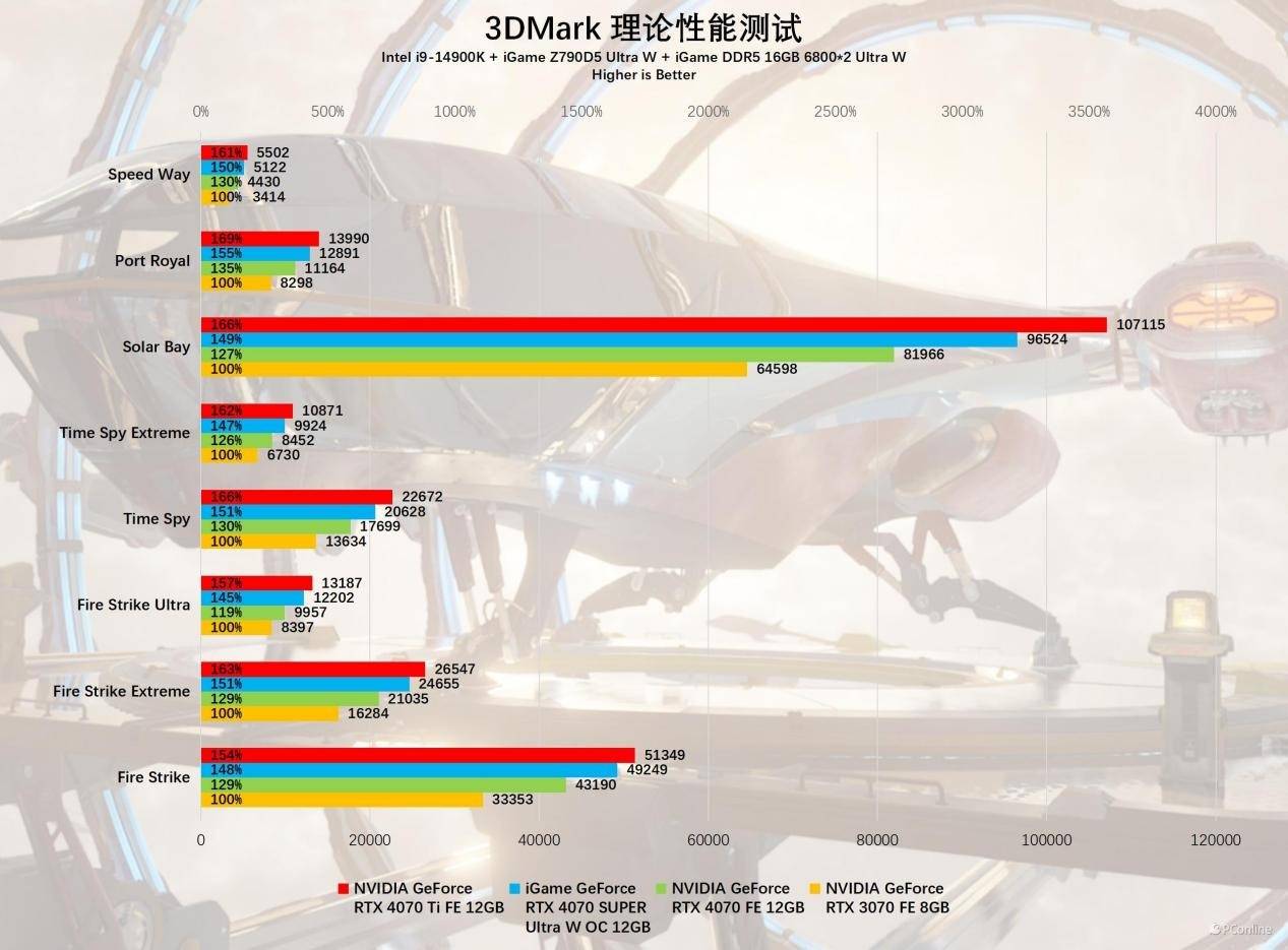 先来的是3DMARK理论性能测,iGame RTX 4070 SUPER Ultra W OC性能表现很是不错,在多个单项测试中大幅度领先上代RTX 3070显卡,尤其是对显卡光线追踪能力较强的项目上,有着较大的领先优势。同时相比RTX 4070 FE显卡,iGame RTX 4070 SUPER Ultra W OC同样有着20%的领先幅度;而相比更高端的RTX 4070 Ti则是有10%的性能差距,这一系列数据表明,RTX 4070 SUPER产品定位还是比较清晰,而且卡位卡得死死的,对中高端显卡市场的影响还是比较大的。