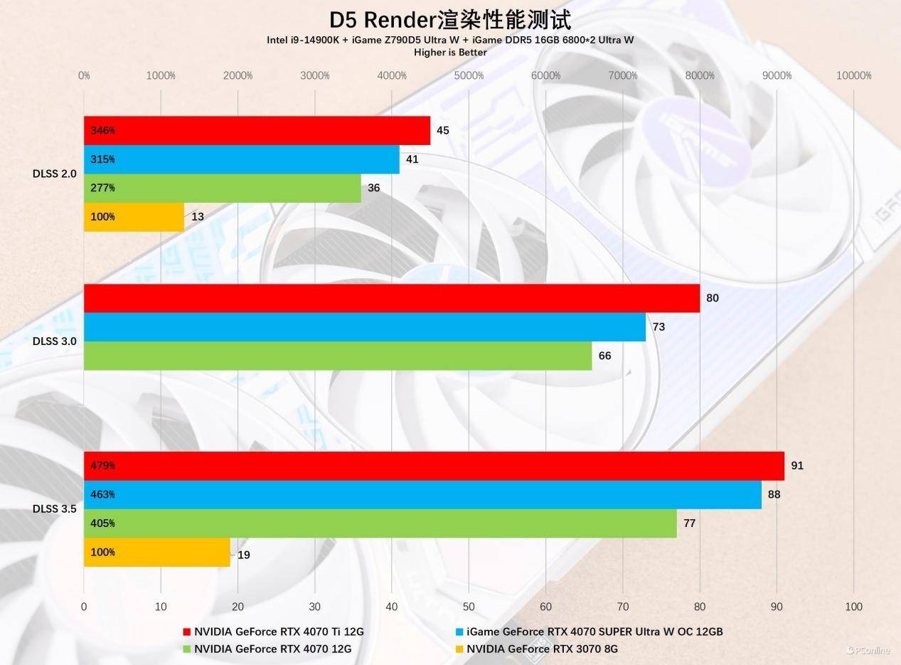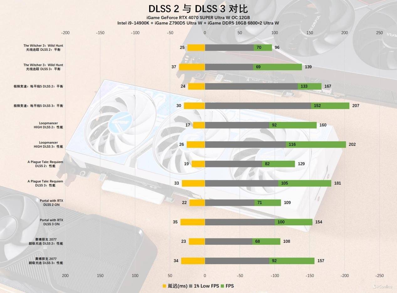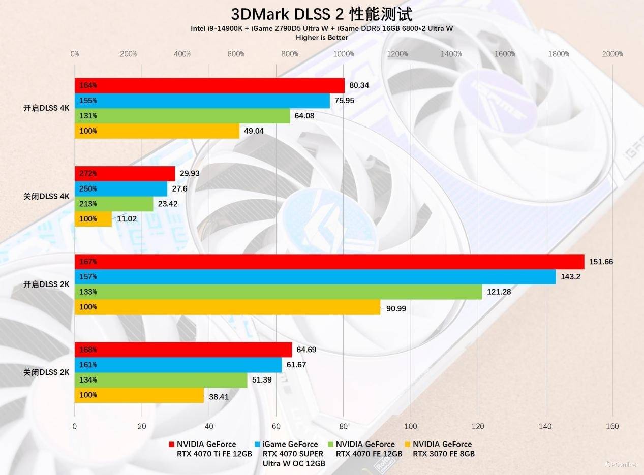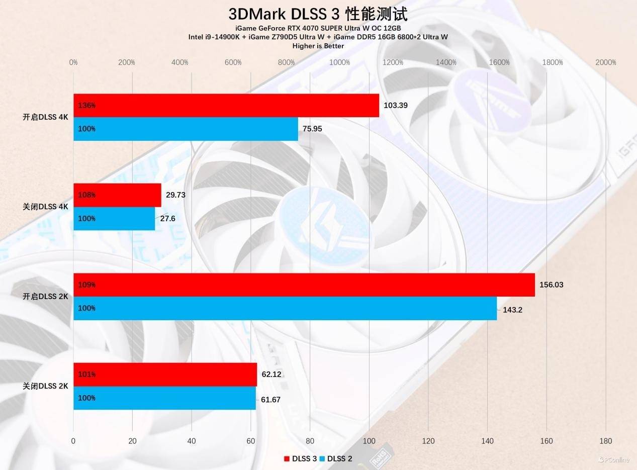 作为NVIDIA显卡黑科技之一,DLSS对游戏流畅度起到了较为关键性的作用。这里我们同时进行了DLSS 2与DLSS 3两者的理论性能测试,iGame RTX 4070 SUPER Ultra W OC在开启DLSS 2之后游戏流畅度直线上升,已经大幅领先RTX 3070与RTX 4070,甚至是直逼RTX 4070 Ti水平。
