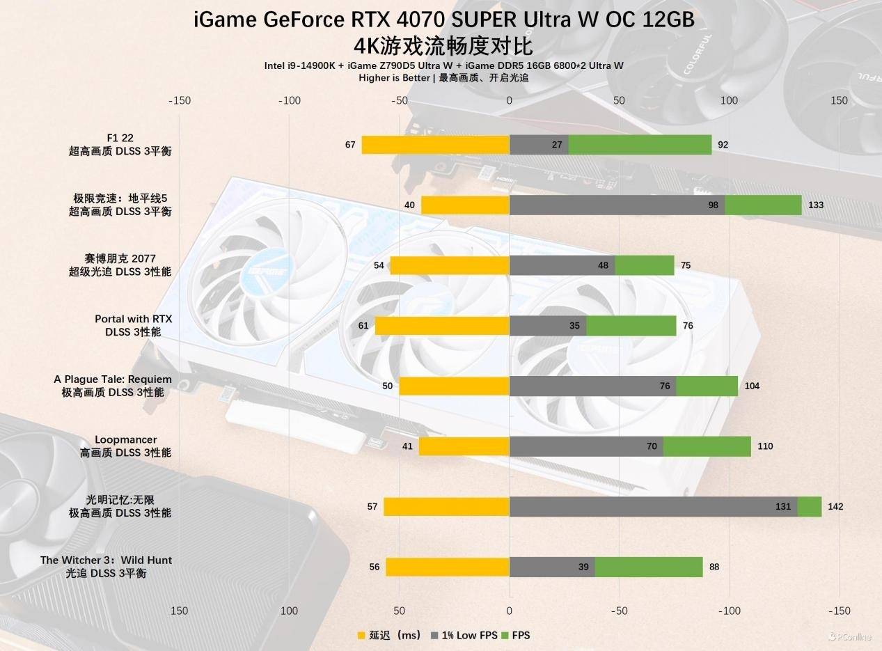 当然对于不太追求高帧数表现的游戏迷来说,iGame RTX 4070 SUPER Ultra W OC玩4K分辨率的主流3A游戏同样给力,在开启DLSS3模式下大部分游戏均能达到75 FPS帧数以上流畅运行游戏。
