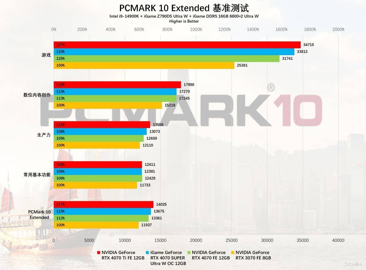 创作性能我们分为了多个方面,首先PCMark10 Extended测试中,iGame RTX 4070 SUPER Ultra W OC在游戏这个子项目上对比前代的RTX 3070与RTX 4070有明显的优势,领先前者幅度高达33%,而领先RTX 4070的幅度也有8%以上,这也跟上述游戏性能测试结果相符。