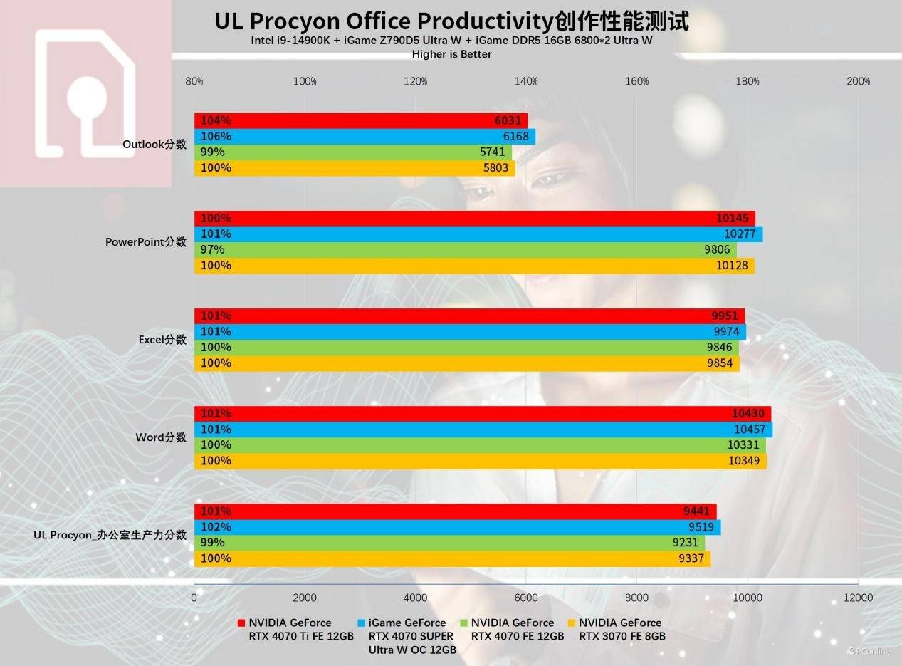 我们更换同样来自UL出口的UL Procyon进行测试,不过对于中高端级别的游戏显卡来说,OFFICE子项测试还真拉不开差跑。
