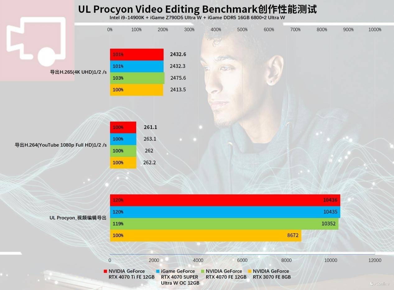 而来到UL Procyon视频编辑处理测试,三块RTX 40系列显卡同样仍未能拉开明显的差距,估计与iGame RTX 4070 SUPER Ultra W OC只有一组编码器有关。