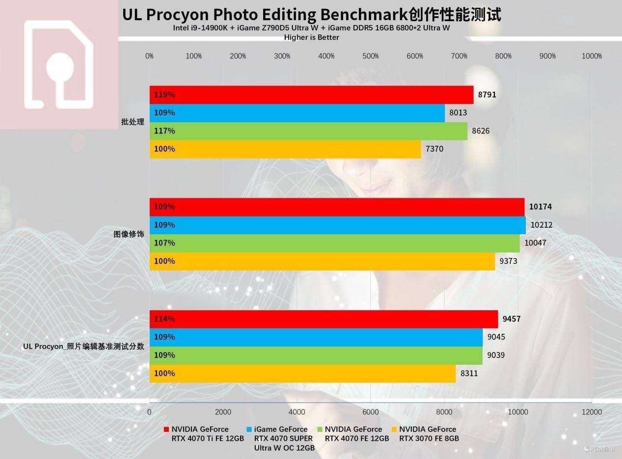于是我们再来试试UL Procyon照片编辑基准测试子项,测试中比较奇怪的是iGame RTX 4070 SUPER Ultra W OC在图像修饰子项的分数是较高的,但是批处理的测试时却较低,甚至比RTX 4070都要低些,笔者估计这与我们所使用的Beta测试版本驱动有一定的关系,优化仍未到位所致。但整体来看,iGame RTX 4070 SUPER Ultra W OC的图像性能仍是在比RTX 3070与RTX 4070有好上些许。