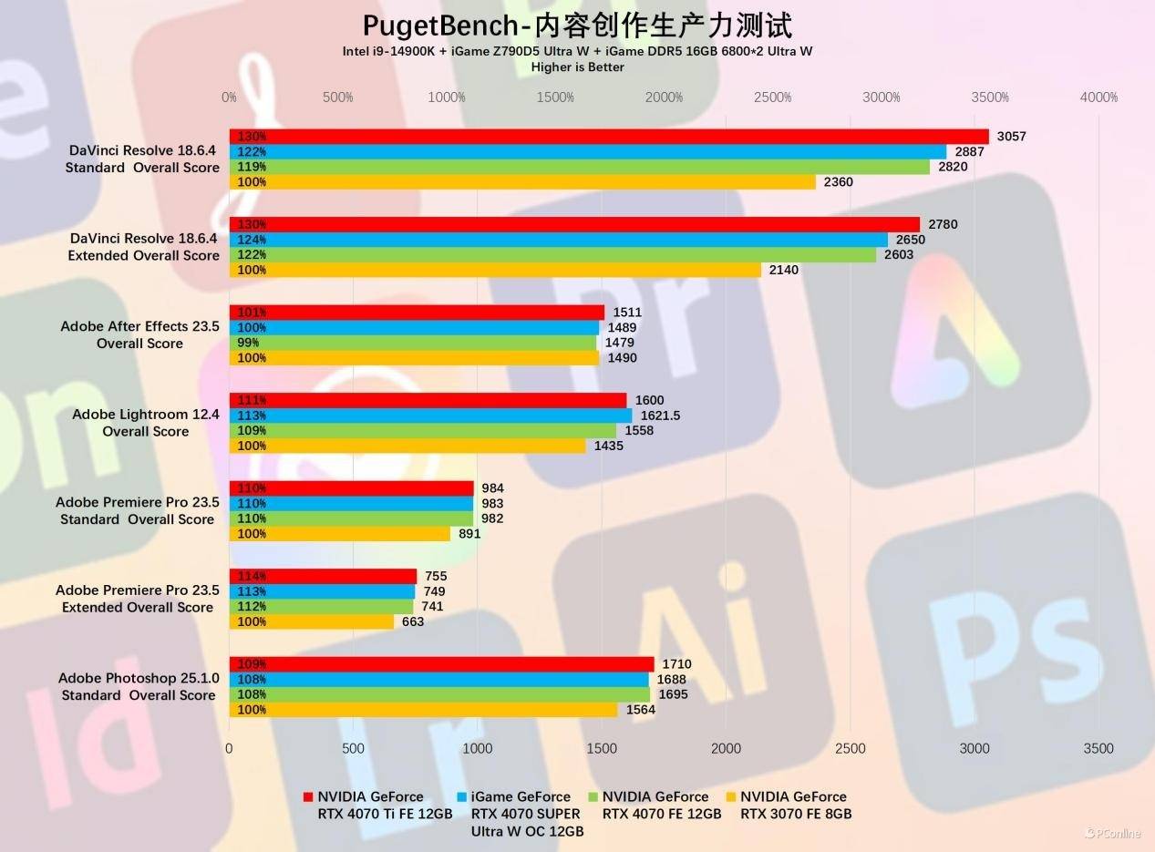UL Procyon测试完之后,我们转头来到PugetBench的Adobe全家桶与达芬奇的测试中。iGame RTX 4070 SUPER Ultra W OC的表现同样很不错,特别是在达芬奇的测试中表现较为出色,仅次于RTX 4070 Ti显卡。