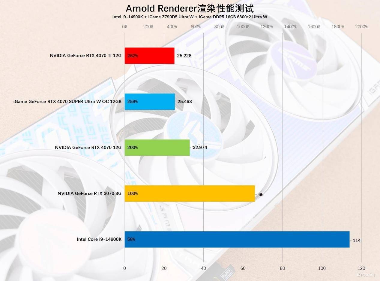 Arnold渲染器是本次RTX 4070 SUPER测试中新增的测试项目,其是一个先进的蒙特卡洛光线追踪渲染器,主要用于电影和高端视觉效果制作。iGame RTX 4070 SUPER Ultra W OC在此项中的性能表现很是强劲,已经和老哥RTX 4070 Ti处于同一级别;对比上一代RTX 3070显卡已经有着159%性能领先优势,同时比单纯的CPU处理更是快了几个量级。