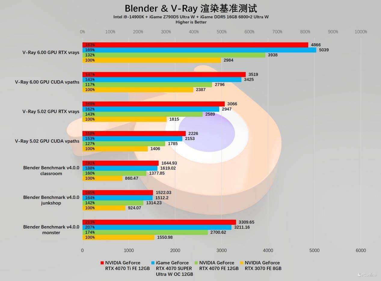 Blender和V-Ray渲染软件有着较大的受众群体,同时其官方也给出了相应的BENCHMARK测试工具,于是这两软件就成为大家在测试显卡渲染能力的常用工具。iGame RTX 4070 SUPER Ultra W OC相比RTX 3070平均有70%的性能提升;对比小弟RTX 4070,性能优势也有20%,这样的性能卡位又再一次地出现了。