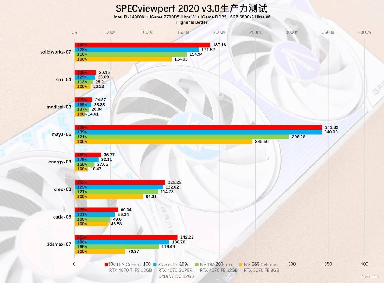 SPECviewperf 2020中,iGame RTX 4070 SUPER Ultra W OC的性能表现很是优秀,部分性能都已经接近老哥RTX 4070 Ti,这性能提升其实真的很划算。