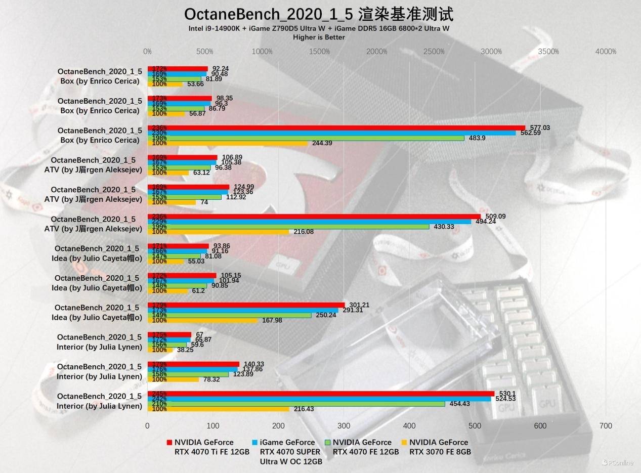 来到OctaneBench测试中,RTX 40系列显卡其实有着先天的优势,这已经是多次首发测试中已经知道的事。而这次iGame RTX 4070 SUPER Ultra W OC提升是最为明显的,性能足足比RTX 3070高了60%以上,比自家的小弟RTX 4070都要好上10%。