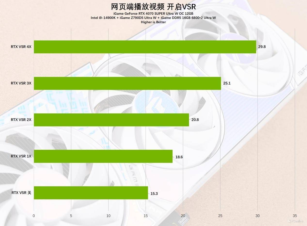 有用户可能担心功耗的问题,我们这里有实测了一下,使用浏览器在线观看视频的情况下,开启VSR 4档,iGame RTX 4070 SUPER Ultra W OC的功耗仅有29W左右,如果你开启的是VSR 1档,那功耗更是不足20W,所以日常观看一些老番或者清晰度比较差的视频时,笔者还是推荐你开启VSR,真的会让画质有一个质的提升。