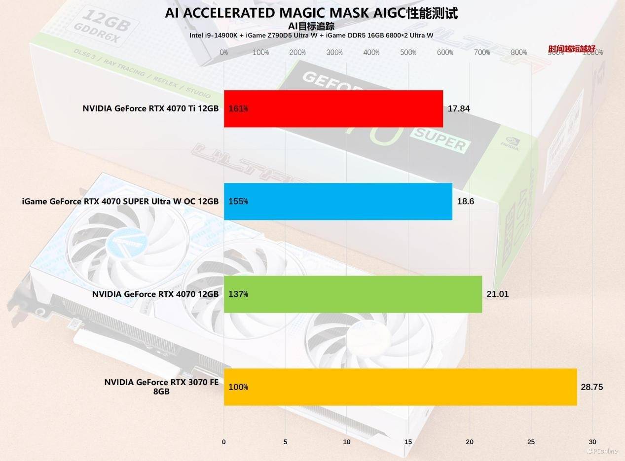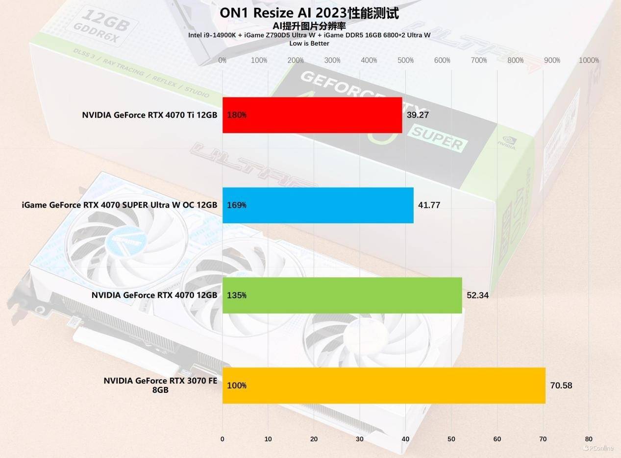 AI应用软件ON1 Resize AI 2023中,使用AI将5张图片提升200%分辨率,此时iGame RTX 4070 SUPER Ultra W OC的速度为平均8秒一张,而上代的RTX 3070为14秒,对比RTX 4070,则新显卡会快30%以上,如果对比RTX 4070 Ti话,二者已经不分伯仲。