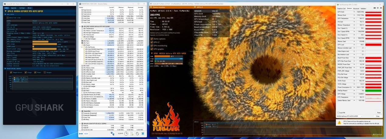 测试室温为25度,Furmark烧机20分钟后,iGame RTX 4070 SUPER Ultra W OC显卡核心最终温度稳定在64.9度,热点温度为76.5度,显存温度为58度,风扇转速约为1700rpm左右,此时显卡的最大功率为219.8W,12VHPWR供电功率为185.3W。