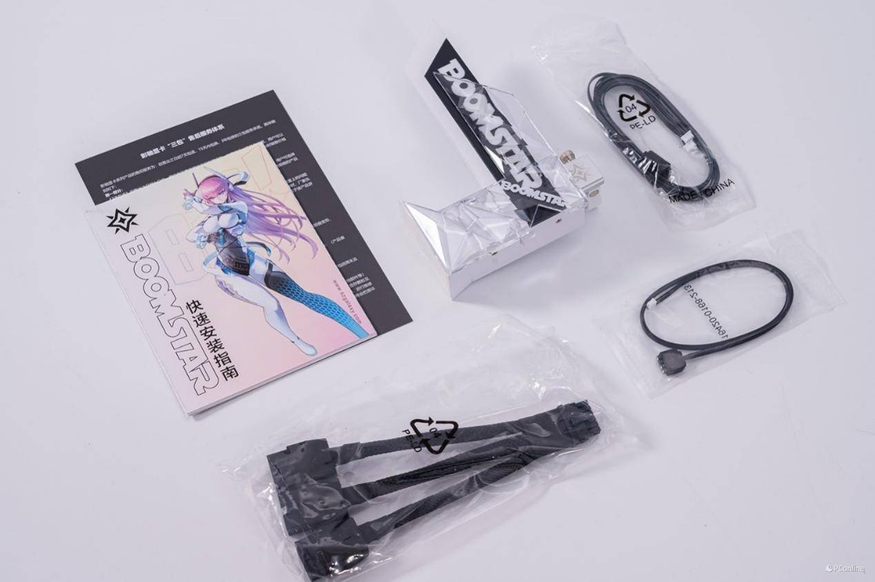 包装盒内除了显卡本体之外,还附赠了1个星曜定制显卡支架,1根12VHPWR转3*8Pin的电源转接线,1根5V ARGB 同步线以及1根显卡支架同步线,另有指南说明书,便捷安装。