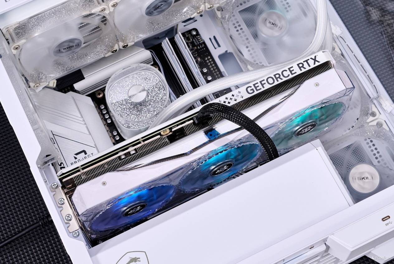 放大看,显卡四周边缘及风扇包边也是钻石切割设计,视觉效果尤为明显,另外这个透明上盖是可以卸下的,玩家可以在白色的面板上打造专属自己的外观。