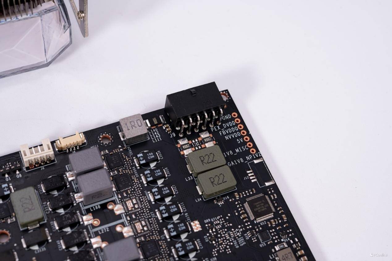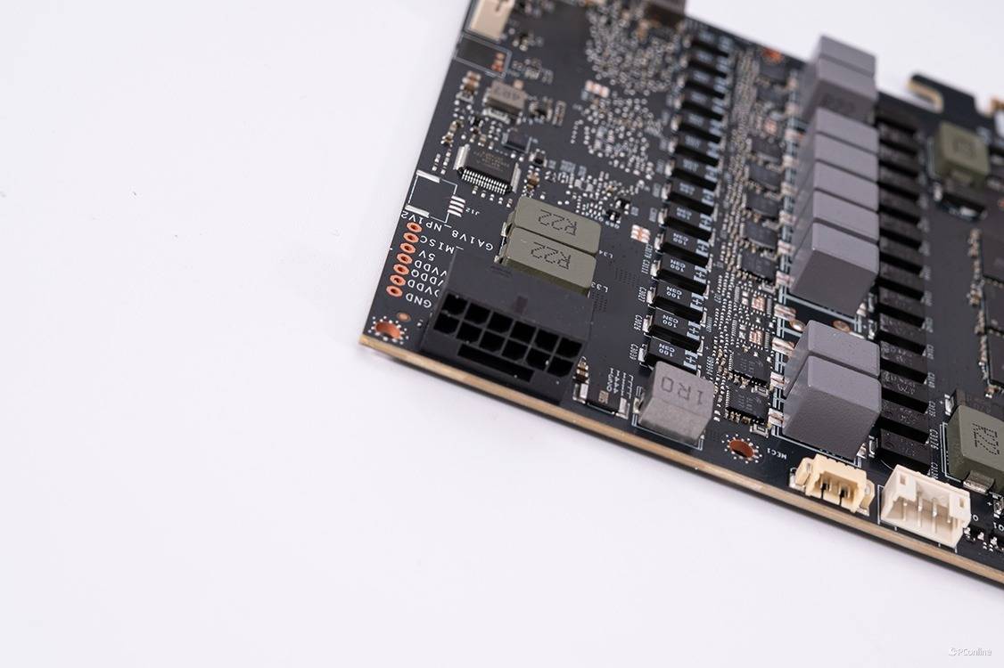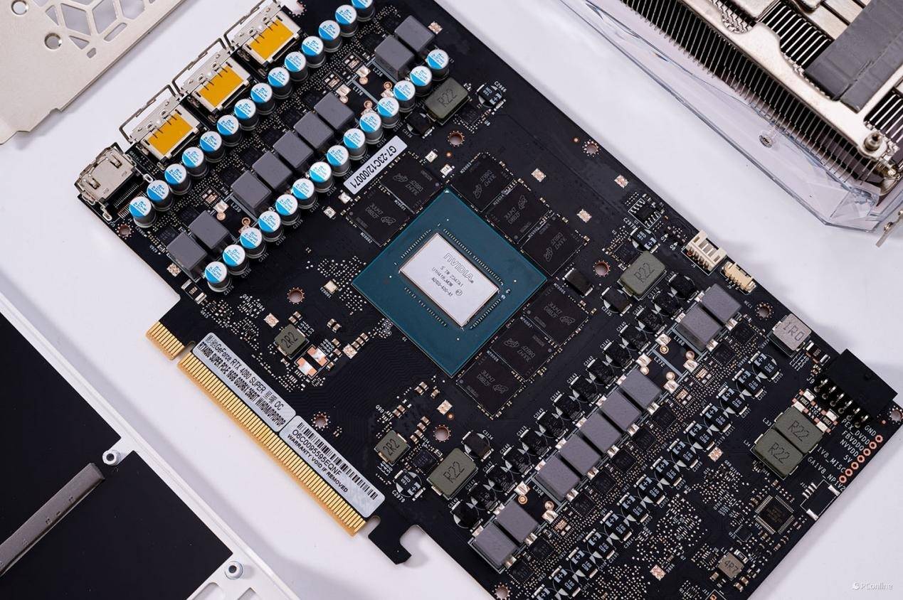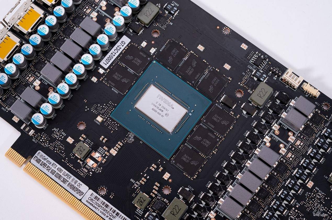 首先看看影驰RTX 4080 SUPER星曜OC的PCB,显然这是一块非公版PCB,采用12层高规格工艺打造,越肩设计,比一般的显卡都要再高一些,不过PCB上的接口、供电、核心、显存,以及辅助供电位置都相当的合理且规正。