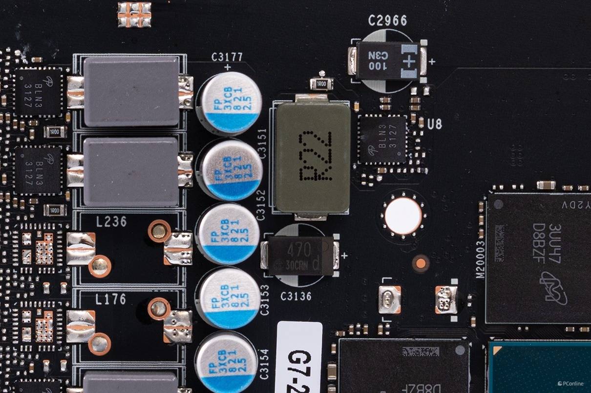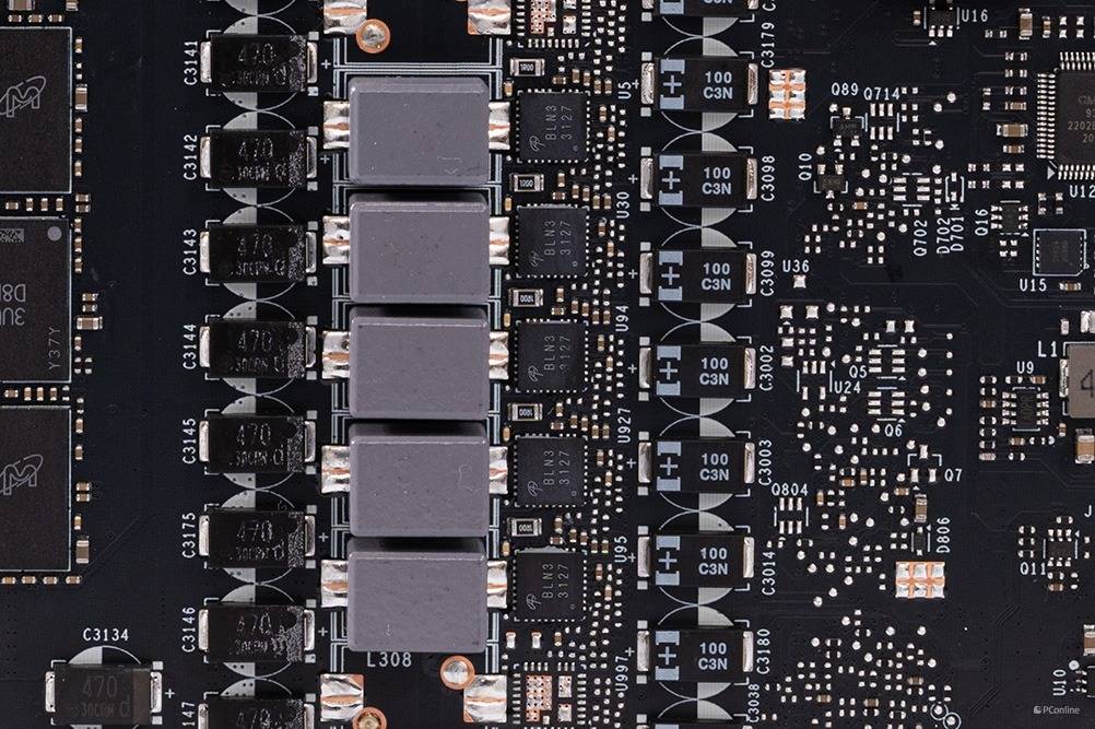 PCB的背面则是密密麻麻的控制芯片,并且在核心的背面还有两颗两个POSCAP(导电聚合物钽电容),有它们坐镇,显卡整体的电气性能会更强。