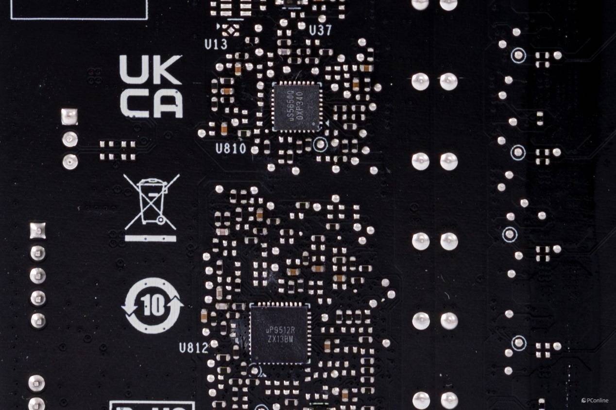 PWM供电控制芯片型号为uP9512R,位于PCB版的背面,用于同时管理核心供电和显存供电。其附近还有一颗负责监控电压/电流/功耗的芯片,型号是uS5650Q。