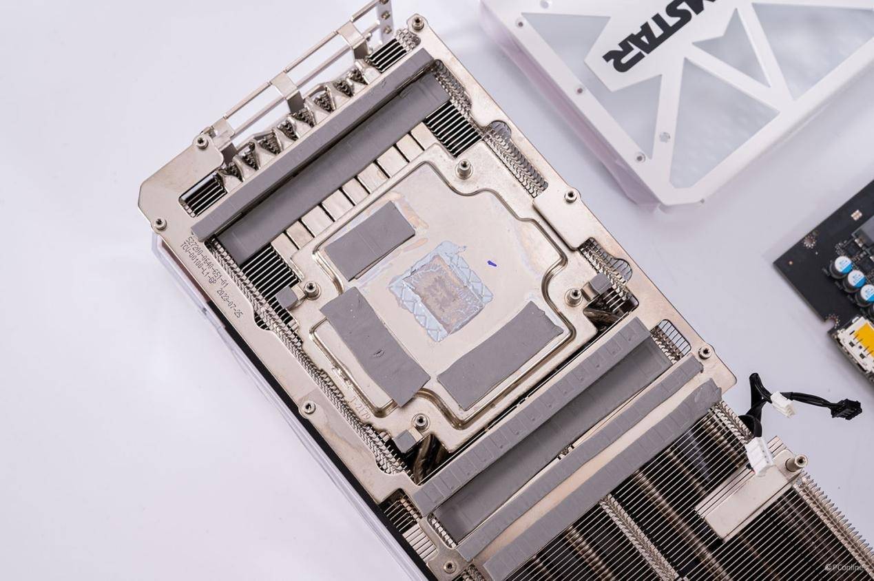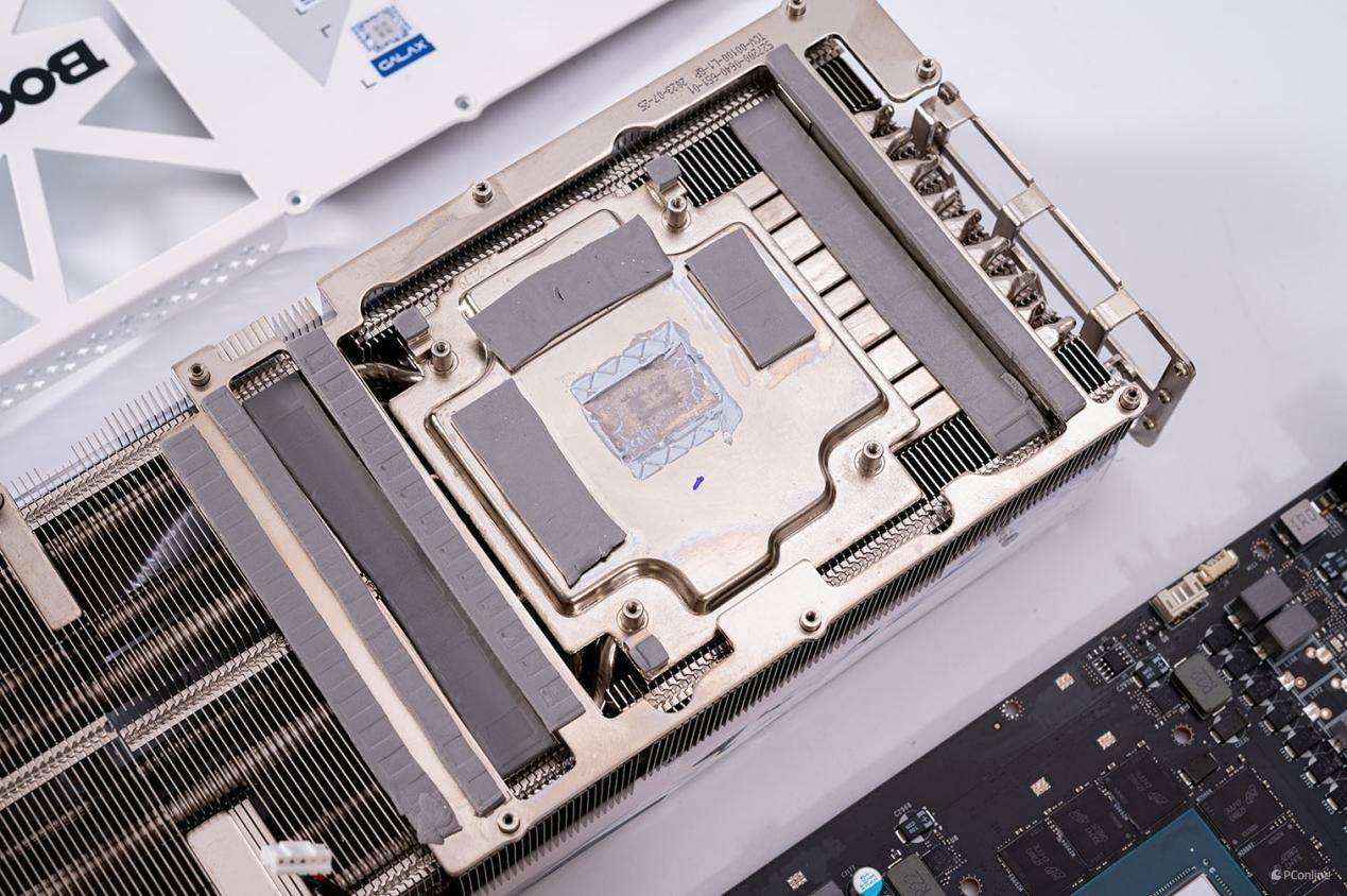 散热部分同样给力,影驰RTX 4080 SUPER星曜OC用的是备受好评的星卓III散热系统,配置相当豪华,散热器的中间是大面积的均热板,影驰在均热板上为显存、电感、MOS管接触的地方用上了高系数的导热垫辅助散热。
