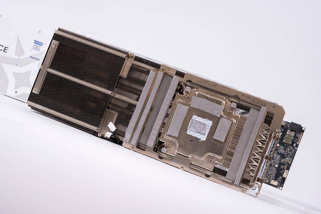 硕大的散热器被分为左右两段式结构,用的是散热效能更强的导流型鳍片。配合金属背板上的镂空设计,有利于空气流通,将显卡内部热量快速带离。