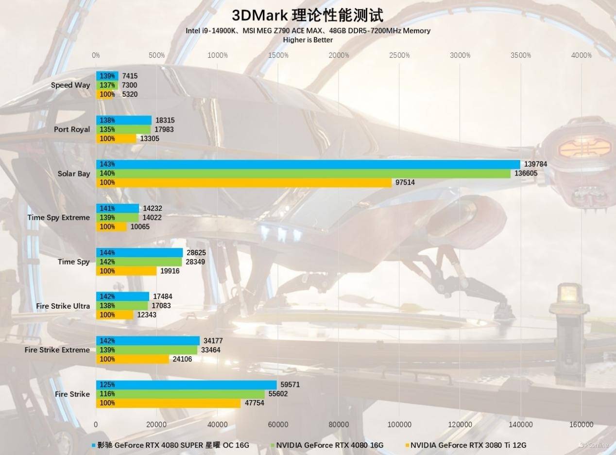 国际惯例,先测试影驰RTX 4080 SUPER星曜OC的理论性能,在3DMark的FireStrike测试中,影驰RTX 4080 SUPER星曜OC表现亮眼,4K分辨率下领先RTX 3080 Ti 42%以上,在以DX12为代表的Time Spy测试中,同样是4K分辨率,新显卡得分14232,一样甩开前作几条街,面对RTX 4080的话,这款显卡则也能有3-5%的性能优势。