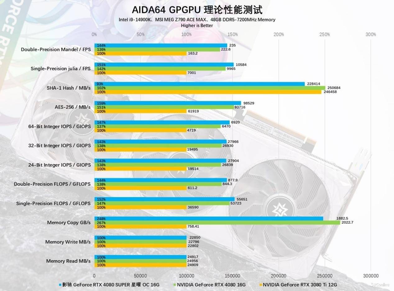 在AIDA64 GPGPU测试中,影驰RTX 4080 SUPER星曜OC的表现和3DMark的测试成绩类似,整体的单精度和双精度浮点算力相比RTX 3080 Ti提升30%以上,面对RTX 4080同样不虚,性能领先依旧有5-10%以上,甚至比在3DMark中的表现还要好。