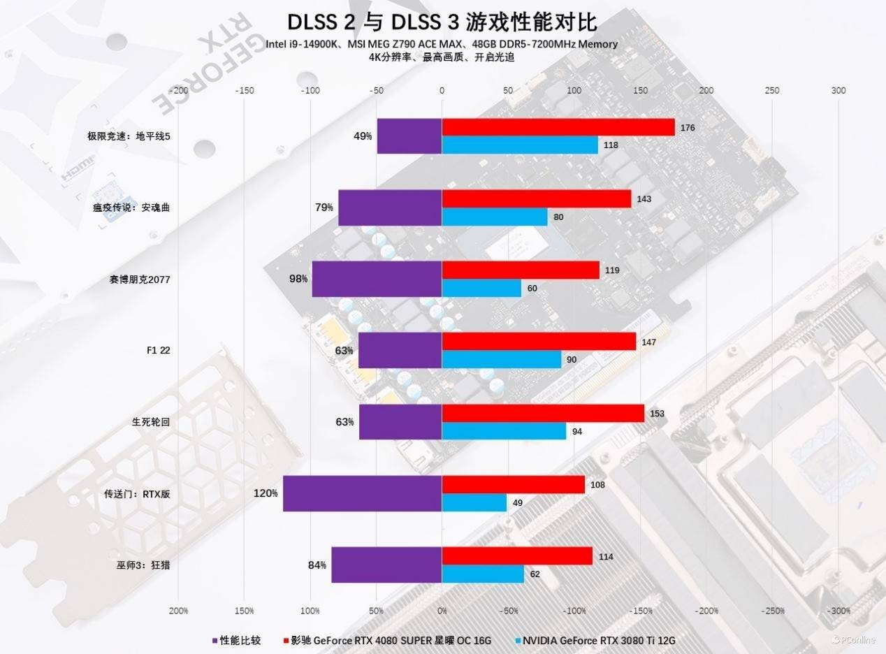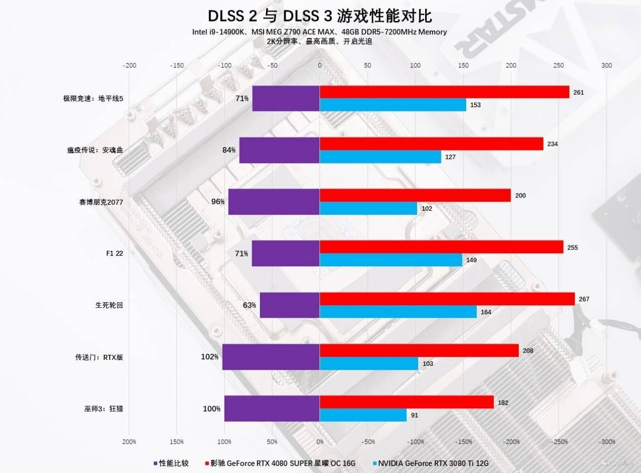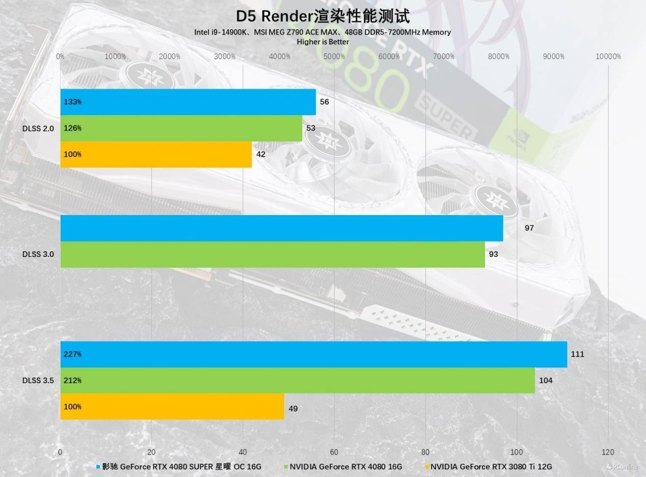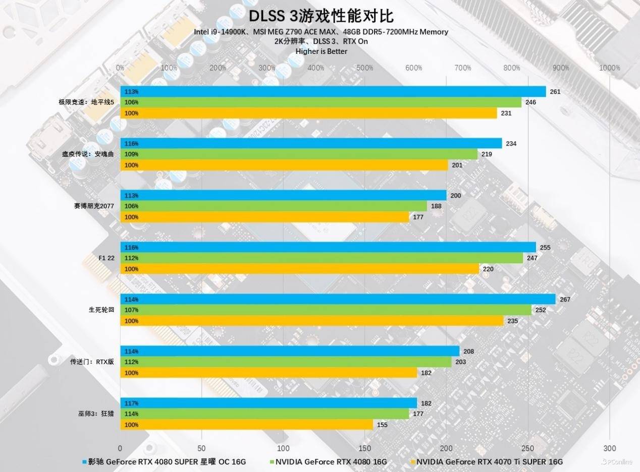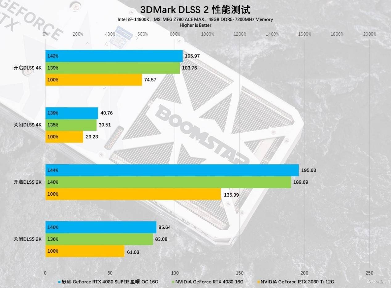 性能层面,影驰RTX 4080 SUPER星曜OC完全可以用顶级来形容,满血的AD103核心带来了更极致的性能释放,与前代RTX 3080 Ti相比,SUPER的加持下拉开了更大的差距,开启DLSS 3以后,甚至有的游戏性能差距可以来到2倍以上!与RTX 4080相比,仍然有约5%的性能领先,其实这一点与规格提升幅度一样,属于意料之中。