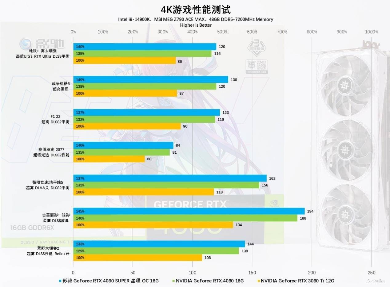 4K分辨率更是影驰RTX 4080 SUPER星曜OC的主战场,更强的规格直接就拉开了与RTX 3080 Ti的差距,不少游戏性能都领先后者高达40%,这个表现其实已经远远超出前代的旗舰RTX 3090 Ti了。如果是对比RTX 4080的话,大部分游戏在4K分辨率下,影驰RTX 4080 SUPER星曜OC也有5%的性能领先。