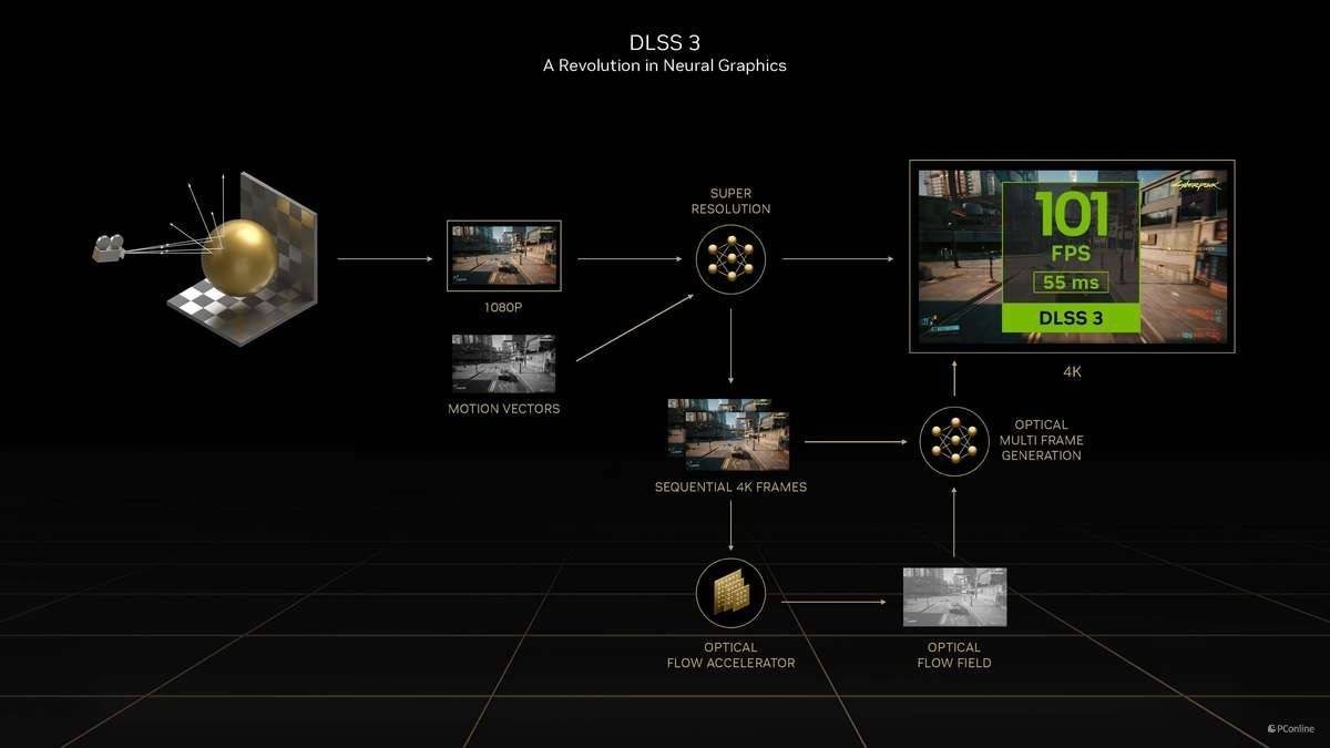 上面的游戏都是基于DLSS 2进行测试,而RTX 40系显卡最显眼的提升就是DLSS 3与DLSS 3.5。在RTX 20系刚推出时,DLSS就带来了超分辨率技术,让显卡能够利用AI对低分辨率的画面超分出高分辨率的画面,从而实现游戏帧数的提升,后续DLSS 3则是在DLSS 2的基础上新增了帧生成和NVIDIA Reflex技术,据说游戏用上这项技术,帧数最高可以做到翻倍的提升!