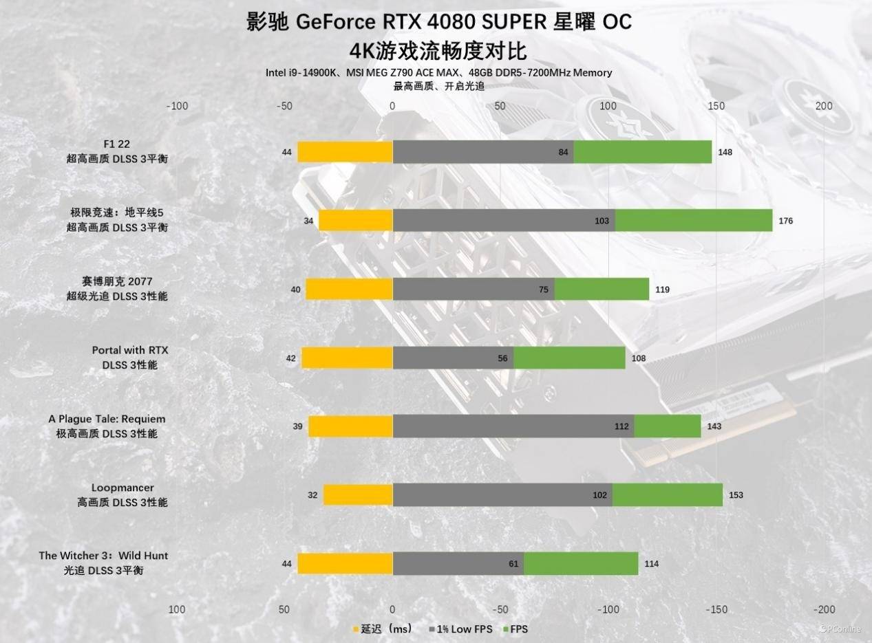 在4K画质下,影驰RTX 4080 SUPER星曜OC的表现也相当亮眼,在开启DLSS 3后,大部分3A大作都能跑到120 FPS以上,基本满足了高刷游戏的门槛。