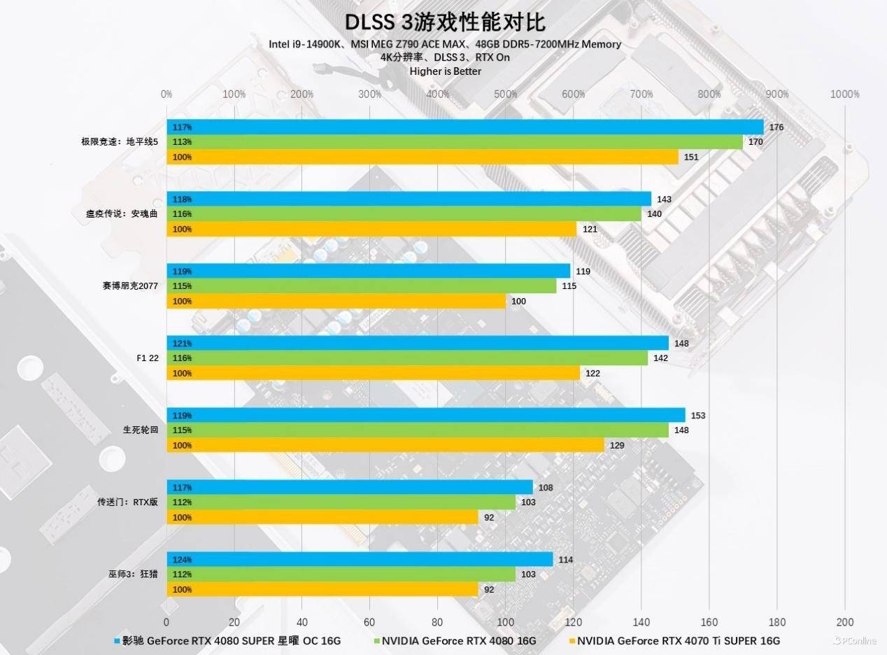 可能也有玩家好奇,那跟RTX 4080相比又如何?其实4K分辨率下影驰RTX 4080 SUPER星曜OC依旧有3-5%的领先优势,要说领先幅度最大的就要属《巫师3:狂猎》了,二者的性能差距足足有12%左右。