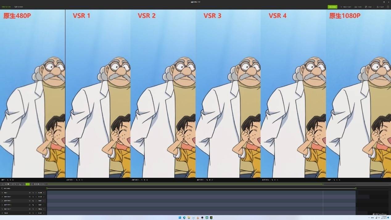 实测环节,可以看到在开启RTX视频超分辨率技术之后,原视频里的人物线条由原本的模糊不清变得十分清晰锐利,并且随着视频超分辨率(VSR)级别的提高,清晰度逐级提升,甚至部分细节已经接近原生1080P了。