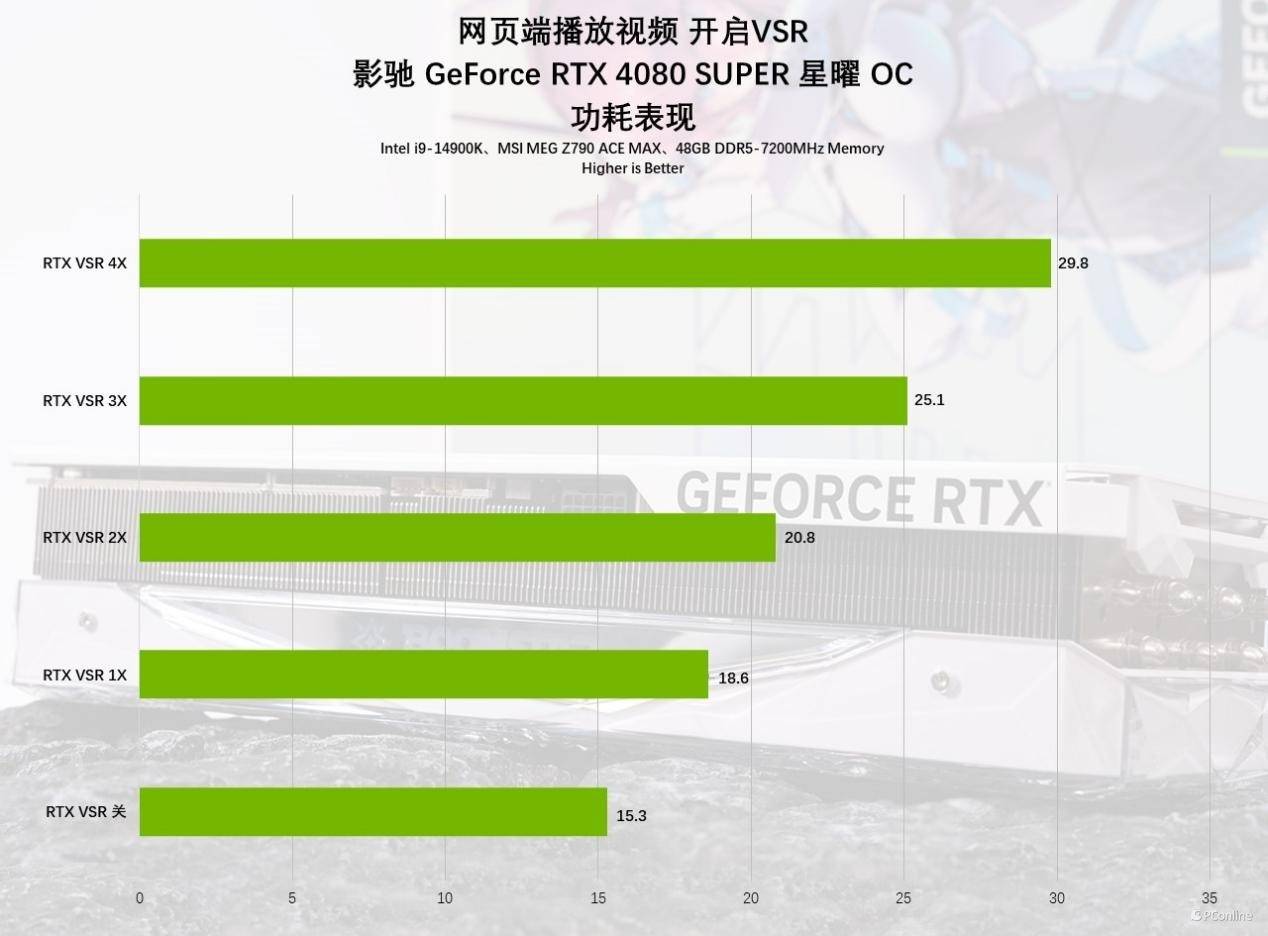 功耗的问题也不必担心,相比起游戏动辄上百W的功耗来说,视频超分辨率(VSR)则相对低很多了。使用浏览器在线观看视频的情况下,开启视频超分辨率(VSR) 4档,影驰RTX 4080 SUPER星曜OC的功耗仅有29-30W左右,基本可以忽略不计。如果你开启的是视频超分辨率(VSR) 1档,那功耗更是不足20W。