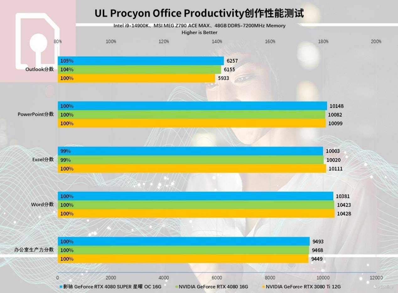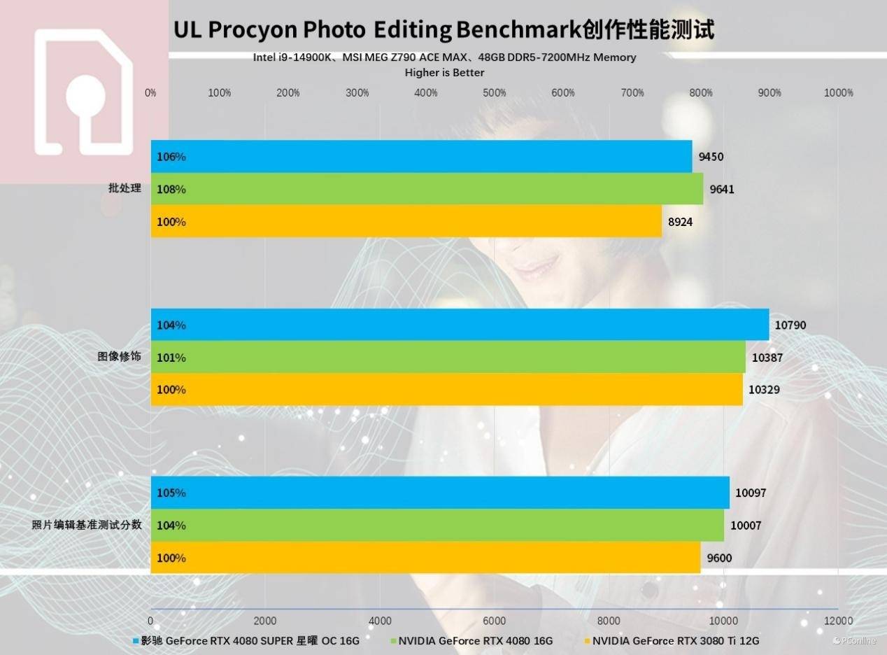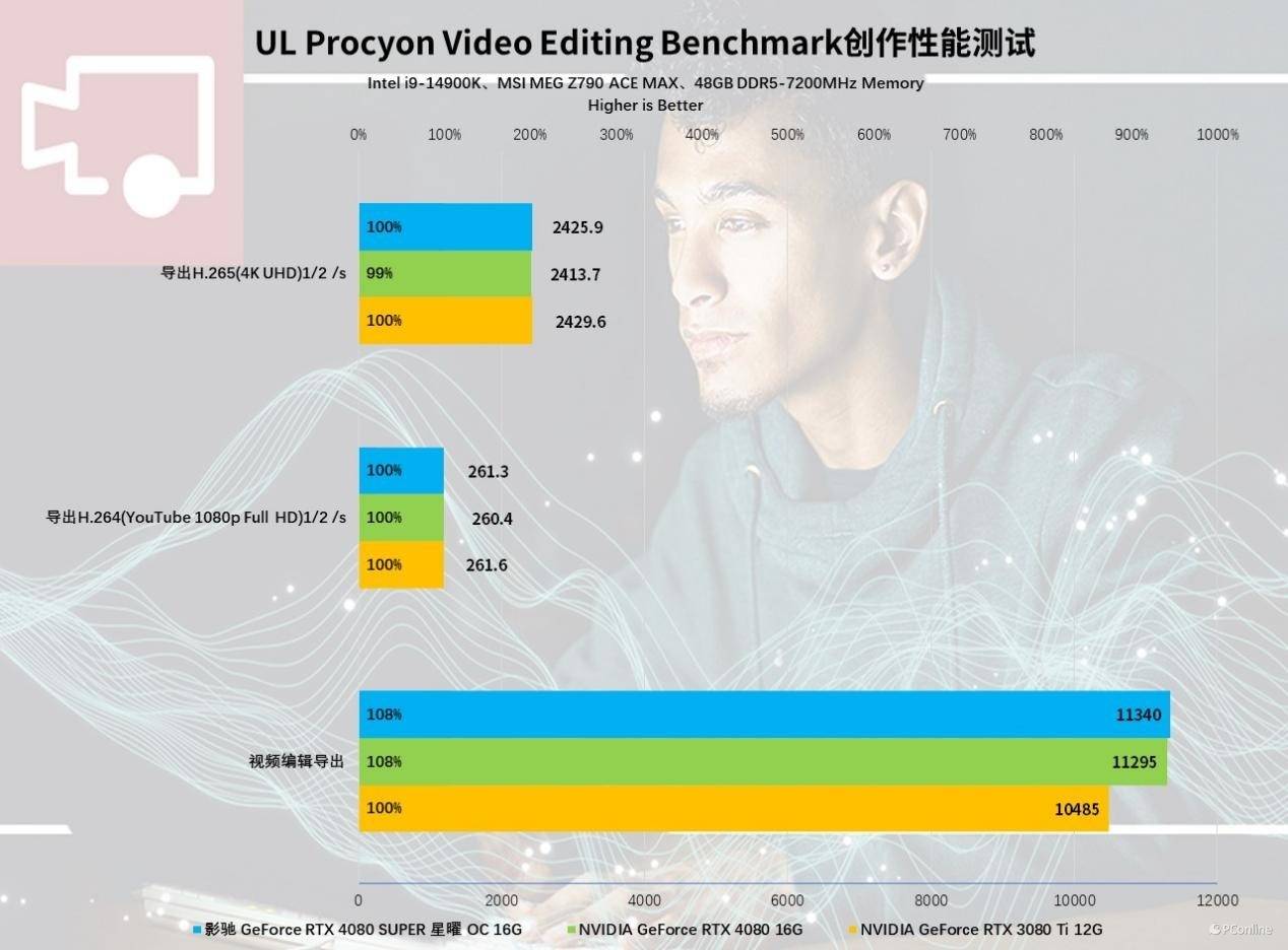 在UL Procyon的图像和视频编辑基准测试中,影驰RTX 4080 SUPER星曜OC整体相比RTX 3080 Ti有着小幅的提升。并且由于采用新的NVENC编码器,整体的编解码效率要比上一代RTX 3080 Ti领先不少,所以在视频编辑测试里领先的幅度也去到了8%,比图像测试的5%要高出一些。